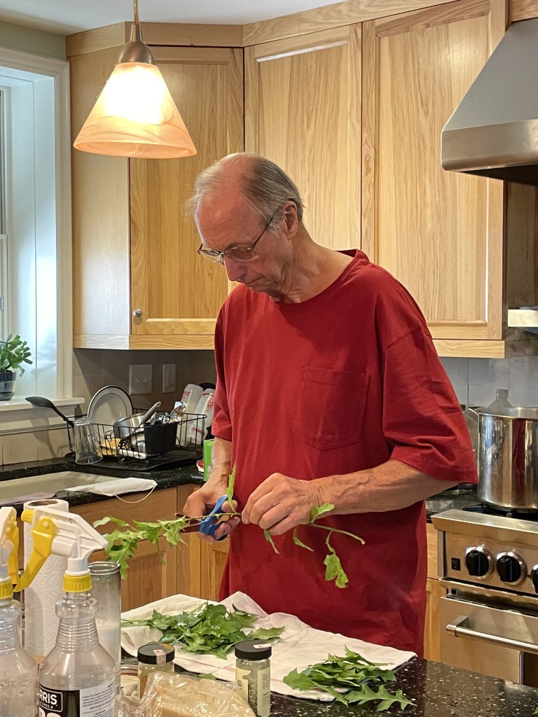 Dennis making pickles- the oak leaves go on top to make the pickles crisp.