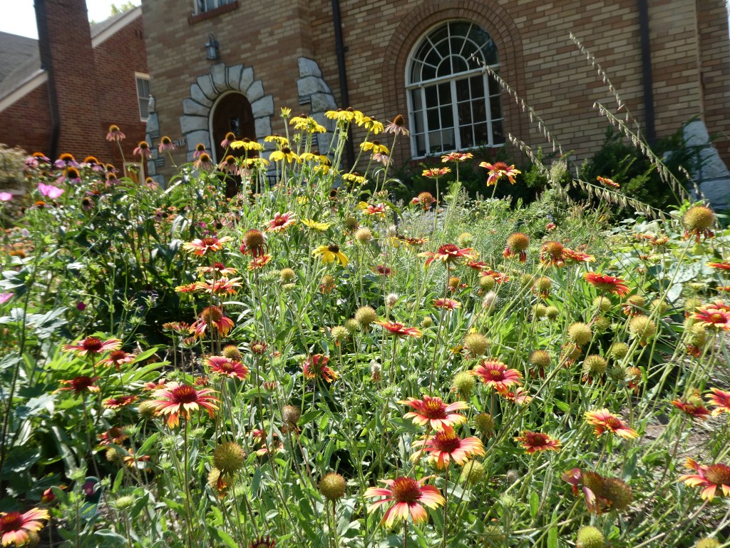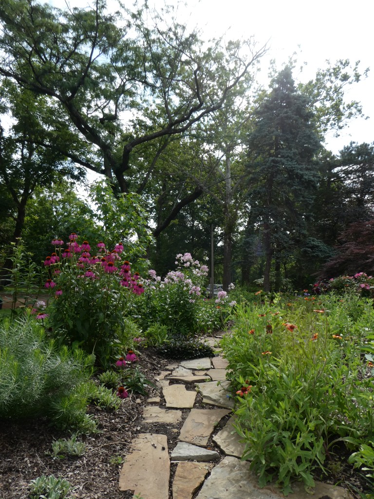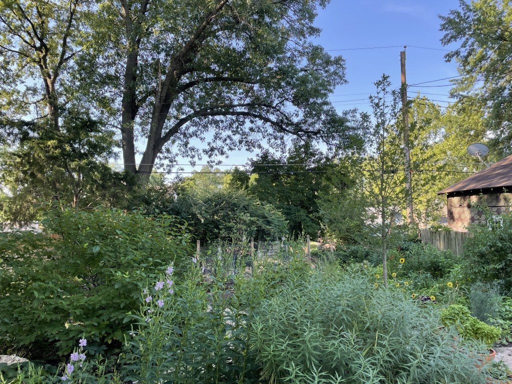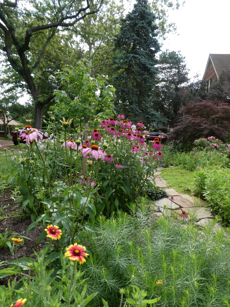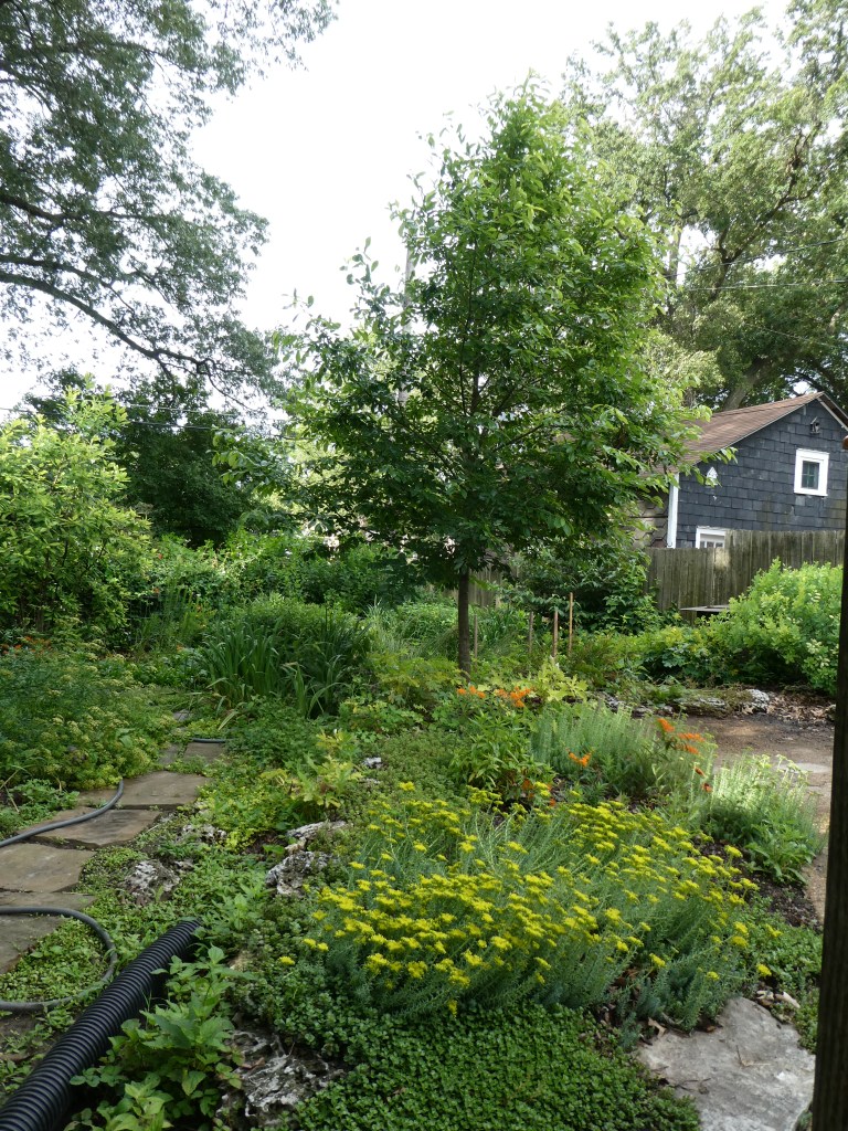 I worked in the front garden this morning early. It is blessedly cool today with cloud cover. Earlier this week it was in the high 90s, the sun was punishing, and I quit my gardening attempts. Sweat in the eyes, clothes drenched after 10 minutes. I cannot imagine being a farm laborer working in such conditions all day. Why on earth deport people who willingly do such difficult work? At any rate, the garden is my refuge from the constant barrage of disheartening news about our lack of humanity and humility. I am heartened to see that my efforts to help our native bees and other pollinators by planting native plants has seen more success this year than last when I was alarmed by the lack of native bees. The spring was very wet and relatively cool, plant growth was phenomenal, and the sun-loving plants we’ve planted since our big maple tree in front was destroyed in a storm are doing well. Now summer is here, though, and the spigot is off. I’ve designated the hottest, most sun-exposed part of the garden as a test area for xeriscaping with plants that don’t need much water.