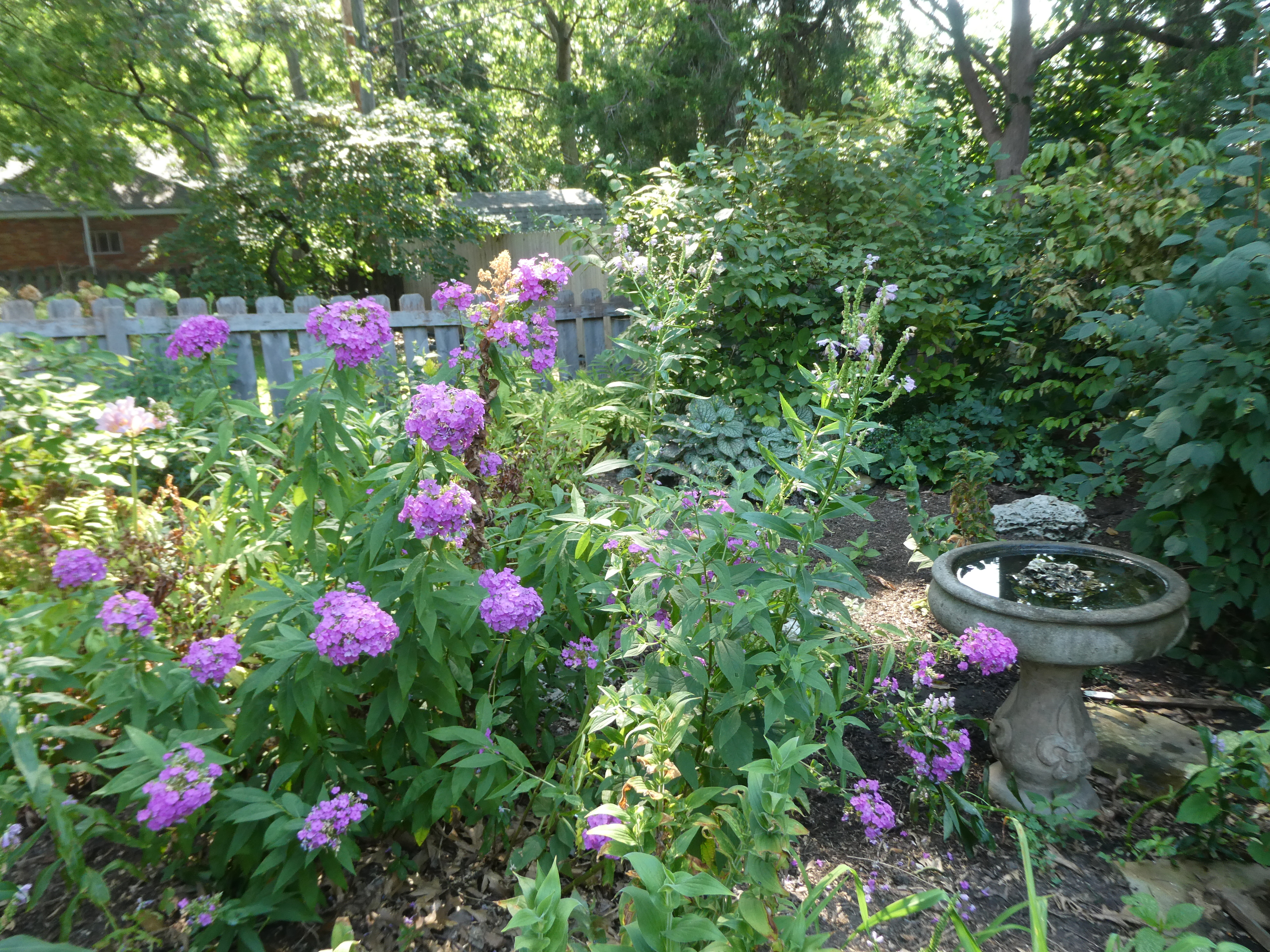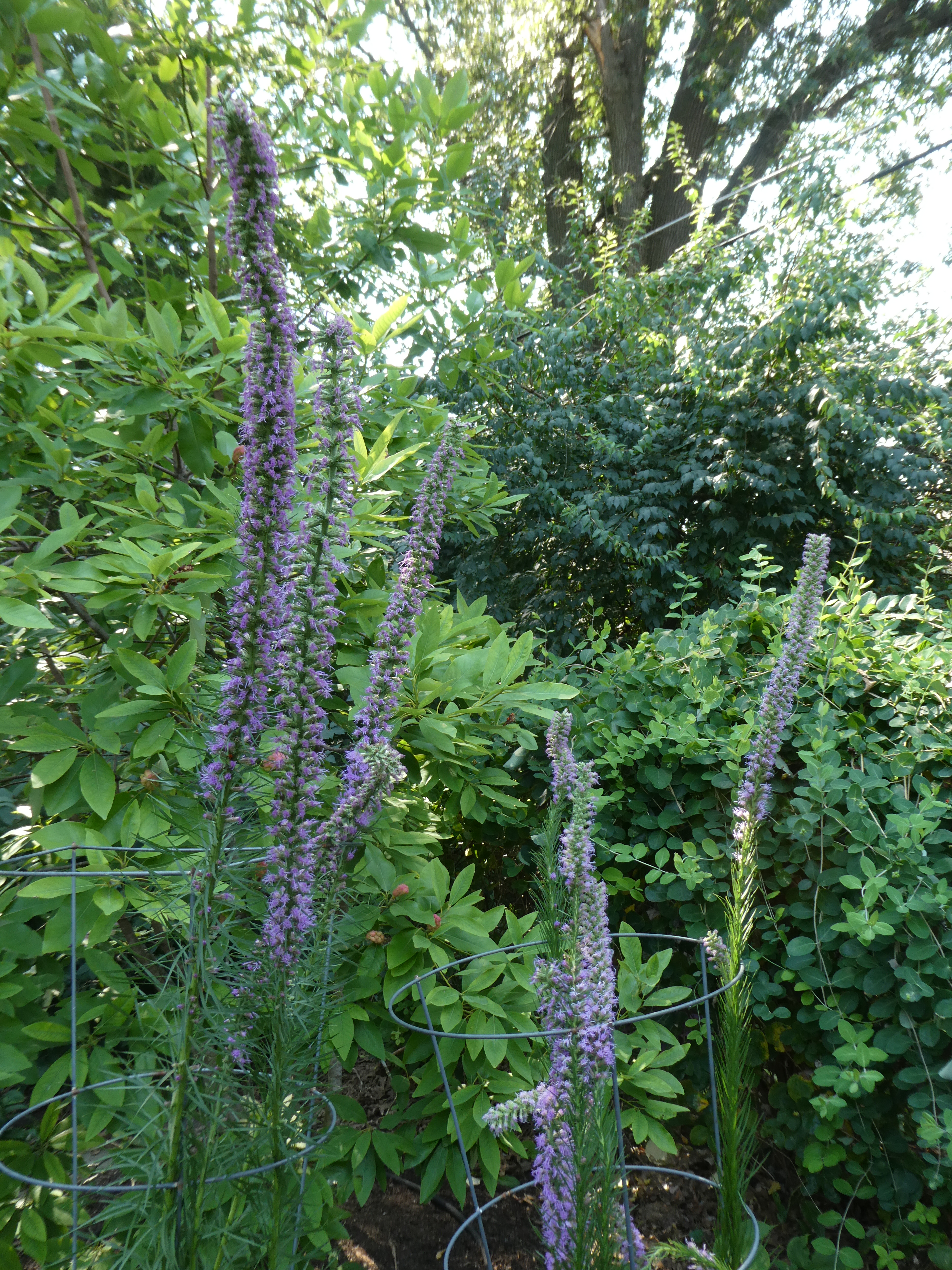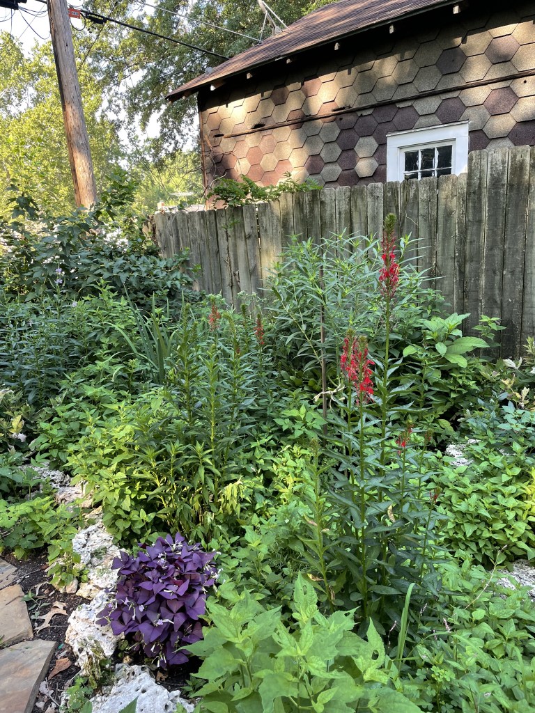 I sat out on the back steps this morning in the shade before 8, before the sun got high and hot. Just watching the goings-on in the back yard. I have missed the yard this week as I’ve had to go to the office to work. Our internet has been down since last Friday (today I am using hotspot on my phone to connect, but it is insufficient for work). This morning Mr. Boots came for breakfast about 6 and as I sat on the steps the little grey-white cat, who is likely one of Boots’ progeny, came through to drink from the bird bath. The hummingbird who has adopted our yard as his territory was busy chasing away interlopers from the nectar in the feeder, the cardinal flowers that are now blooming, and the physotegia. He seemed to tolerate several smaller hummers, who must be his progeny. Perhaps they built their nest in the neighbor’s elm that borders our yard, though the nest would be too small for us to see from the ground.