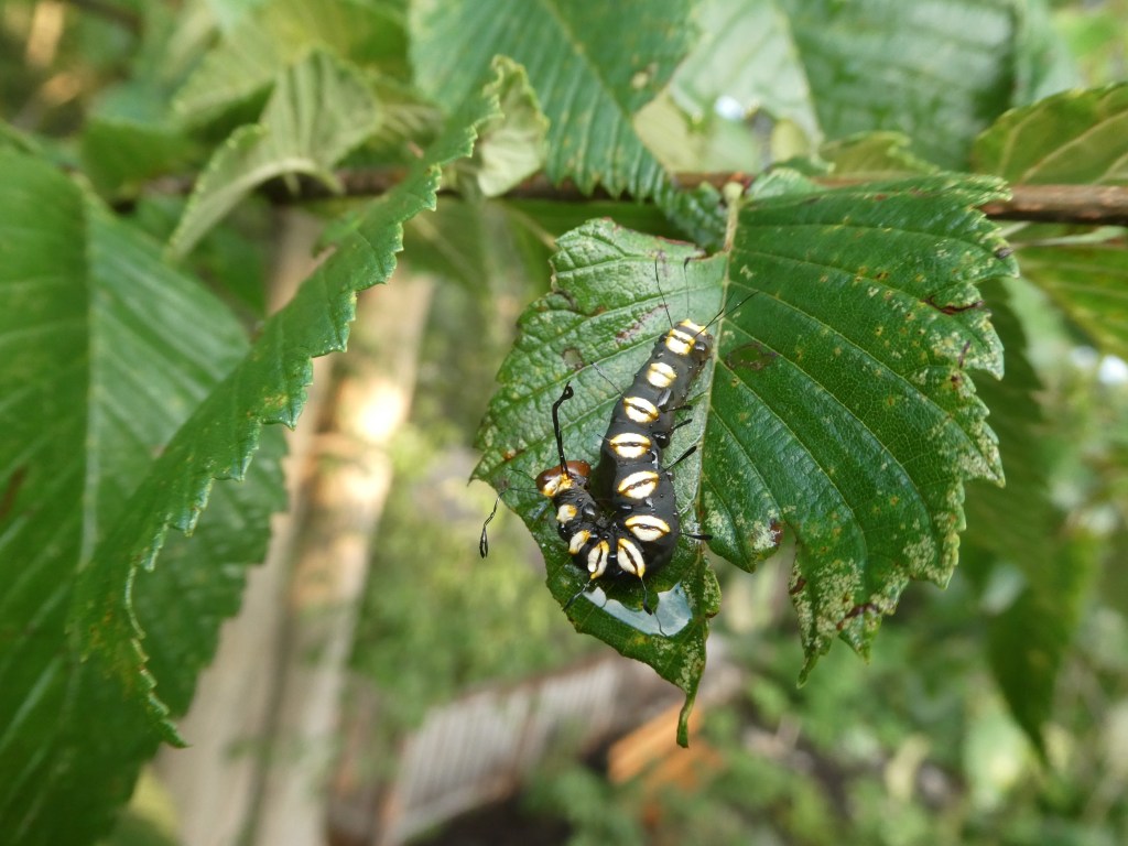 I am in love with our garden and all the creatures it hosts. Some examples: On Thursday we noticed 6-8 large – probably 5th instar- monarch caterpillars on the butterfly weed plants I grew from seed in the spring and planted in the sunniest, hottest place in the yard, which is where the sycamore used to shade everything before we took it down. Those caterpillars have since disappeared, and I assumed the wrens who have raised young nearby this summer had stolen them for their young. But no – likely not. I read that the monarchs ingest a form of poison from the milkweed that makes them unpalatable to bird predation. So our hope is that they have moved into their chrysalis stage and that in a week or 10 days we’ll be seeing freshly emerged monarch butterflies. I did see some a week or so ago, 4 at once in the back yard, 3 of whom appeared to be having some sort of mid-air quarrel, and came to find out that male monarchs are very aggressive with each other. Those were likely from the milkweed as well, so if they made it to butterfly-hood perhaps the caterpillars we saw this week will too. We have also seen tiger swallowtails, whose host plant is the ninebark at the back of our rain garden, and black swallowtails, whose host plants are dill and parsley and fennel, also in the garden. There are also loads of bumblebees of different types this year, which makes me very happy because last year we seemed to have a deficit. They especially like the physostegia, which also hosts several varieties of tiny beetles.
