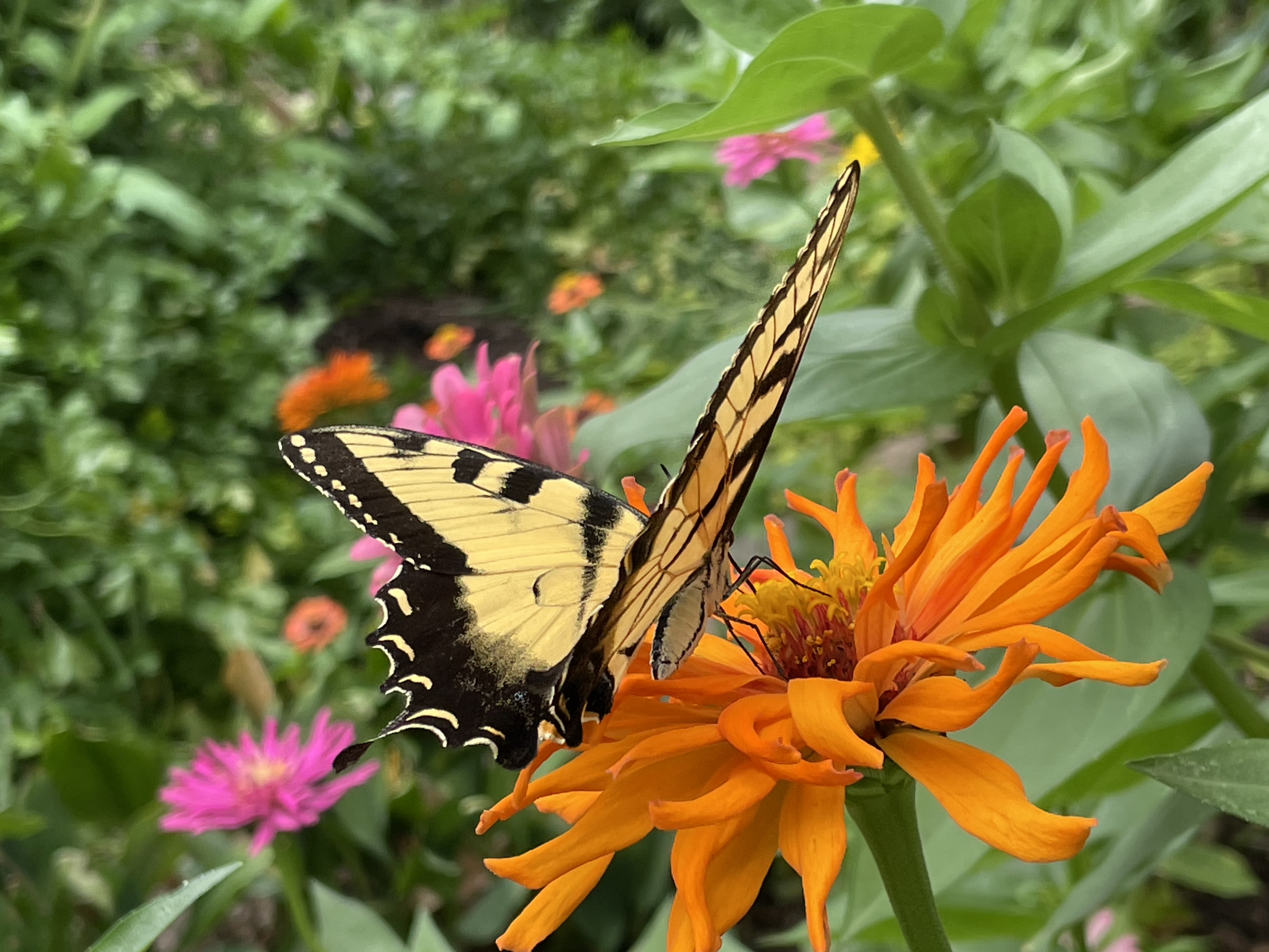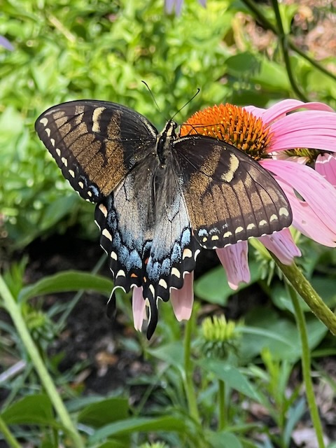 We removed the big sycamore tree last winter and were wondering how many of the plants would be lost in the process of machinery and dropping limbs. Not many as it turns out. We planted a blackgum tree towards the front of the back yard and a sweet bay magnolia towards the back, both of which the birds seem to like just fine. The hummer has a particular branch in the blackgum that he sits on to survey his kingdom. We have lots of interesting bees and wasps and even a few butterflies that made it past the wrens and the wasps. Our neighbors across the street have a bee hive and their bees come over here for the water and flowers. Butterflies: Tiger swallowtail and Black swallowtail are the ones I’ve seen most. We did see a single monarch a few weeks ago.