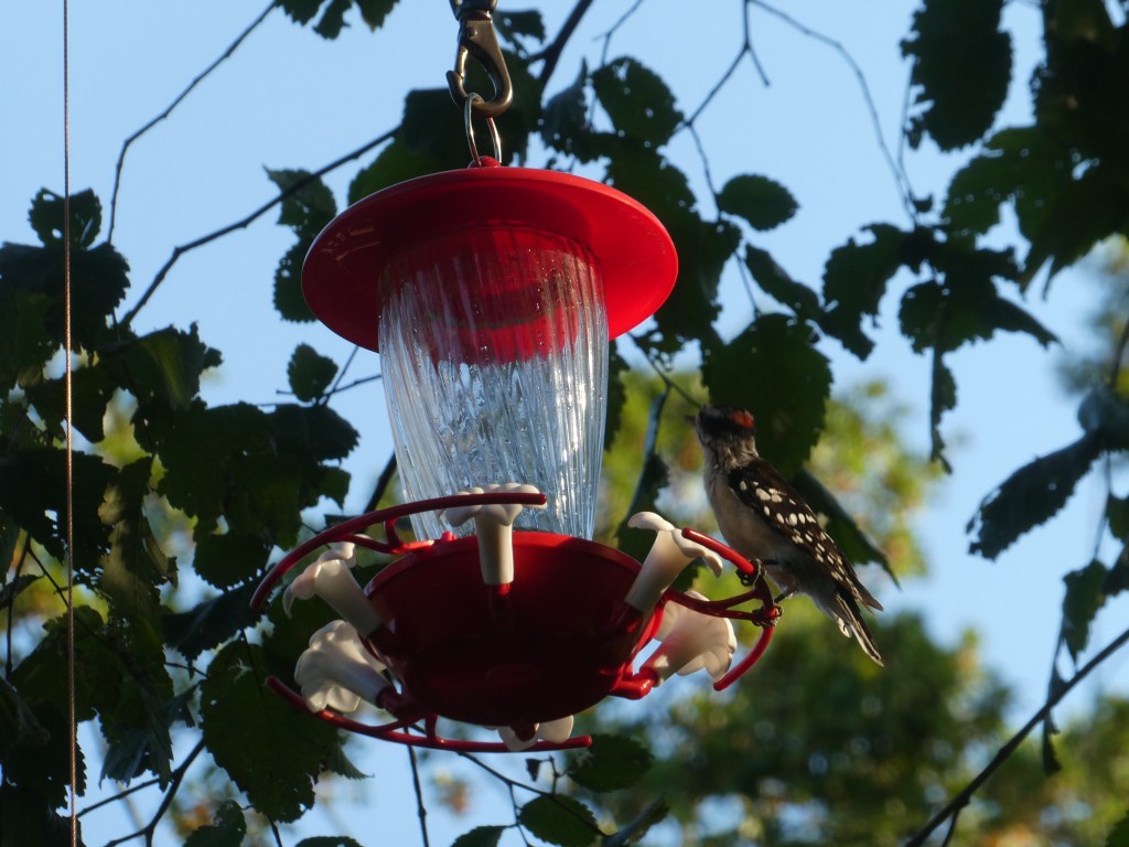 The male hummingbird who has overseen and protected the feeder from interlopers all summer came so close to me as I sat on the porch that I could hear the buzz of wingbeats and feel the movement of air. I’ve read that they have the largest brains relative to body size of any bird and think they may recognize me as the creature who makes sure the feeder is clean and the nectar fresh. Likewise, the honeybees who come to get water at our birdbaths seem to know Dennis and me when we freshen the water- they buzz around our heads waiting for us to finish so they can get back to their business. Addendum a few minutes later: the hummingbird buzzed me again and it was not the male hummingbird but a female, probably a young one; the male sat on a twig nearby and fussed, probably chastising the young one not to get so close to me. Oh – there is a downy woodpecker who has figured out that he can drink the sweet nectar from the hummingbird feeder and we see him fairly often too.