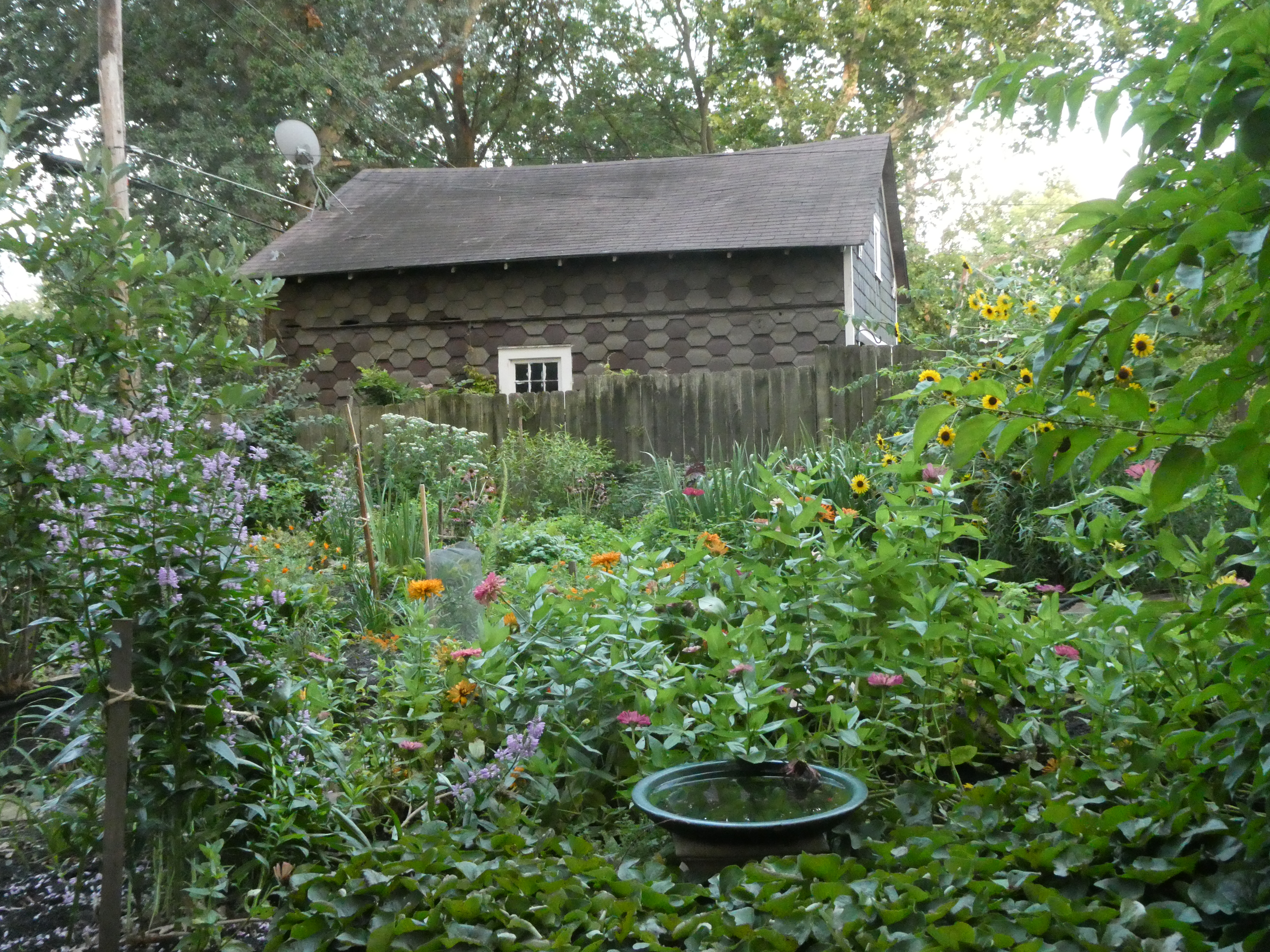 The goldfinches come to eat sunflower seeds from the big sunflowers that sprang up without being planted. Everyone visits the zinnias we started from seed this year, because we finally have enough sun and because they are such happy-looking flowers. We never had enough sun when the sycamore was here. This is the first year we have had colorful blooms in the garden in June and July, thanks to the change in light.