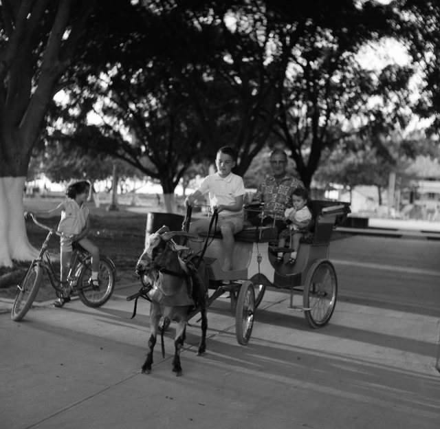 My older brother driving a goat cart, me and my grandfather in back