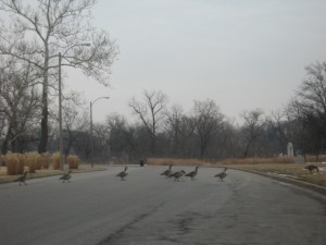 Geese were crossing the road in the park this morning on foot. Not many impatient drivers and those there were didn’t threaten them.