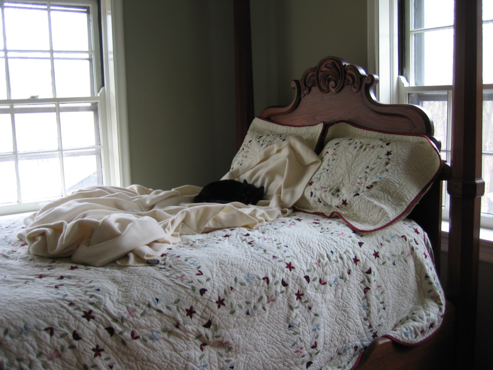 She is no longer traumatized, very much at home, and has become queen of the 4-poster that used to be my Aunt Helen’s. She spends most of her days here and roams the house at night. The monster games have resumed and she shows no signs of wanting to go outdoors. Could it really be this easy?!