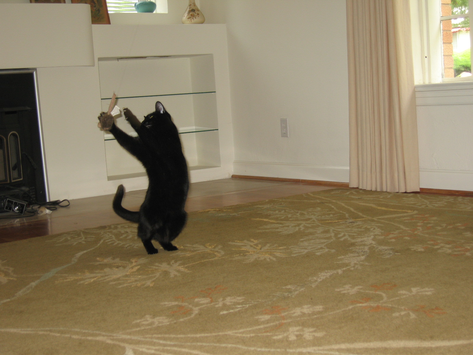 Britches playing Dennis’ new game- he ties the mouse to the end of a fishing line.