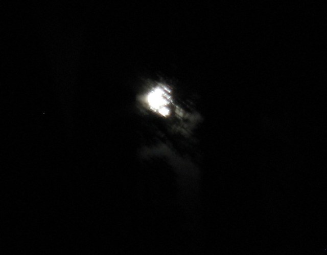 The full moon through the trees in the back yard-