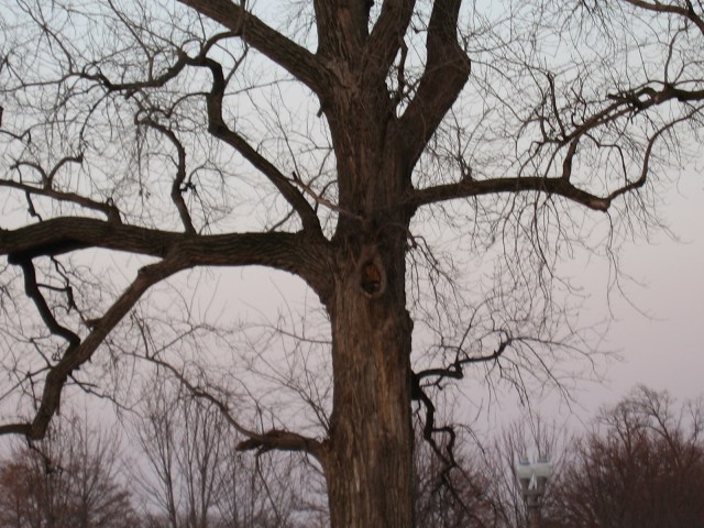 This morning we went to the woods in the park before dawn in the cold rain and wind to see the Great Horned owls- I love doing this. And we did see them, and the young’uns in the nest. It’s a full moon today but so cloudy that only a slight moon glow was apparent- maybe this evening the moon will be bright between the two cottonwoods where it was on Tuesday night. (these pictures were taken Thursday evening before the sun went down) These two cottonwoods are the owlets’ neighborhood. They stay in the one on the left. Charles and Sarah, the parents (who pair up for life, until one dies and then the other will take on a new mate), have nested there before, so Mark the owl man tells me. Every year the cycle repeats: After raising their young and kicking them out of the neighborhood to go find their own territory, Charles and Sarah renew their bond (Mark says they do this by singing together, duetting), go through a mating period, and maybe have the briefest of rests before they build a nest and hatch some owlets. Then Sarah stays with the owlets while Charles does all the hunting. Mark’s friend and fellow owl-lover Brenda, whom I met Thursday night, once saw a food exchange. She heard Charles call, a different call than usual, and then saw him arrive on the scene with a big cottontail rabbit in his talons. Sarah, haveing heard the call, flew out of the nest and met Charles on a flat limb, where he gave the rabbit to her, then Charles flew off again. Sarah flew off into the woods with the rabbit and ate a bit of it, then brought the rest back to the nest to feed the young. They also will cache some food in hollow limbs. Every year, day in and day out, they do this. Sounds exhausting! I know this is what they DO, there’s not much choice in the matter, but I still admire the simplicity of it all, and their devotion (allowing myself a little anthropomorphism) to their lives and their tasks.