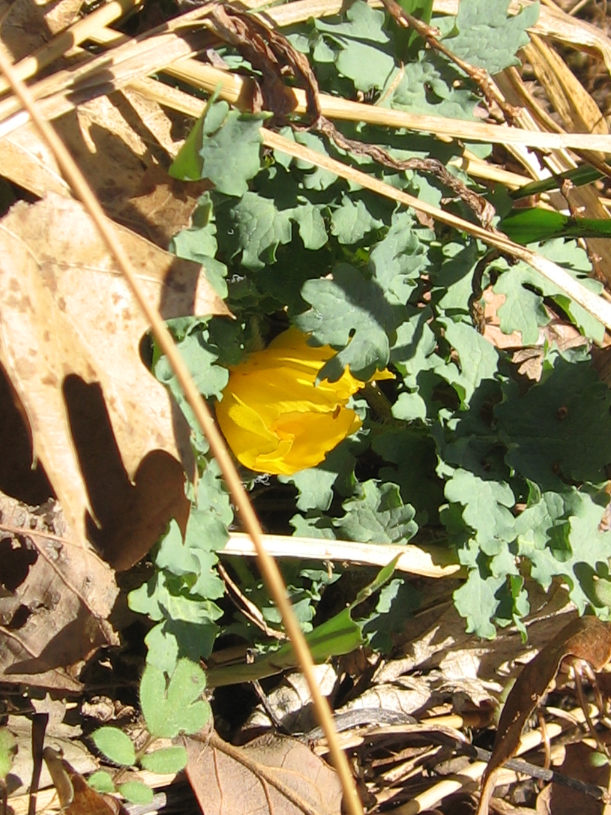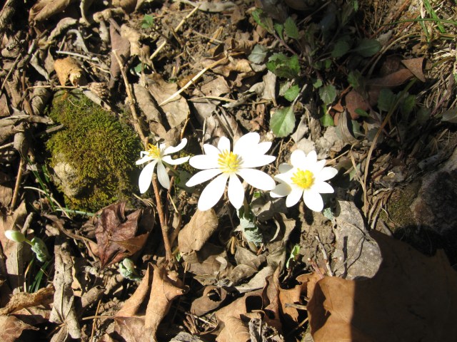 This morning I went to the arboretum and had a solitary walk, Dennis having another commitment. It was very quiet until I heard a hawk calling from the woods near the prairie and then 3 or 4 hawks came to her- young ones I’m guessing? She was getting them in line perhaps. In some places not much has changed, but by the time I was leaving there were spring beauties where there’d been none earlier. Along the high south-facing rock ledge I saw a lizard and startled a snake out sunning. Saw an early celandine poppy and trillium, too. I watched as a covey of more than a dozen quail crossed the path one-by-one, and saw two does in the woods.The sun was bright so the pictures aren’t great, but good enough to document.