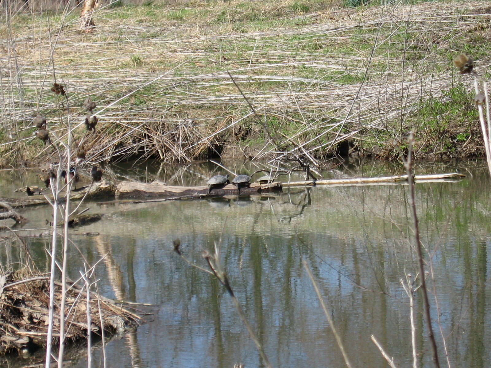 on walk saw trout, perch, turtles, frogs, wasps, song sparrows, no female red wings yet