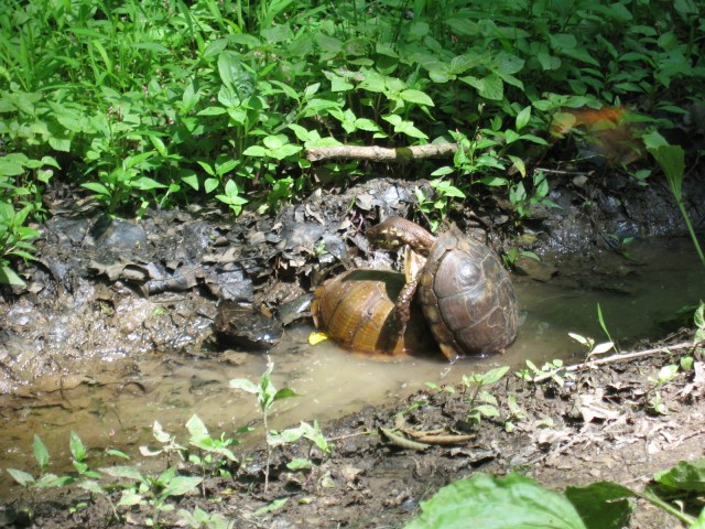 We happened upon these 2 turtles mating. When we got here we saw them near each other, with the one turtle who turned out to be the male raising his head way out of his shell and bobbing it around, while the female turtle would withdraw into her shell and then come out again. He repeated his head-wobbling dance several times and then, when they seemed to have reached an agreement, he climbed onto her shell and had to raise himself way up with his legs to effect their coupling. They seemed not to notice us when we finally walked on by. I did love the head-wobble dance.