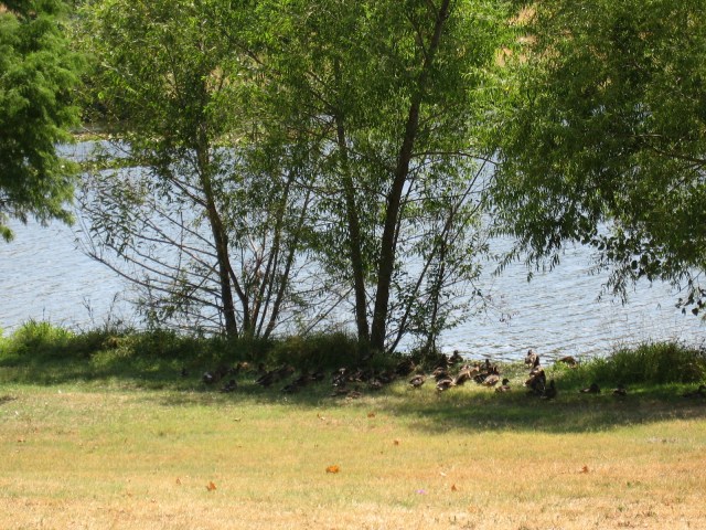 landscape is just brown. I did see a bunch of tunnel spider webs in the brown grass. And ducks hanging out in the shade near the water. Not much other life, though. I don’t like this at all.