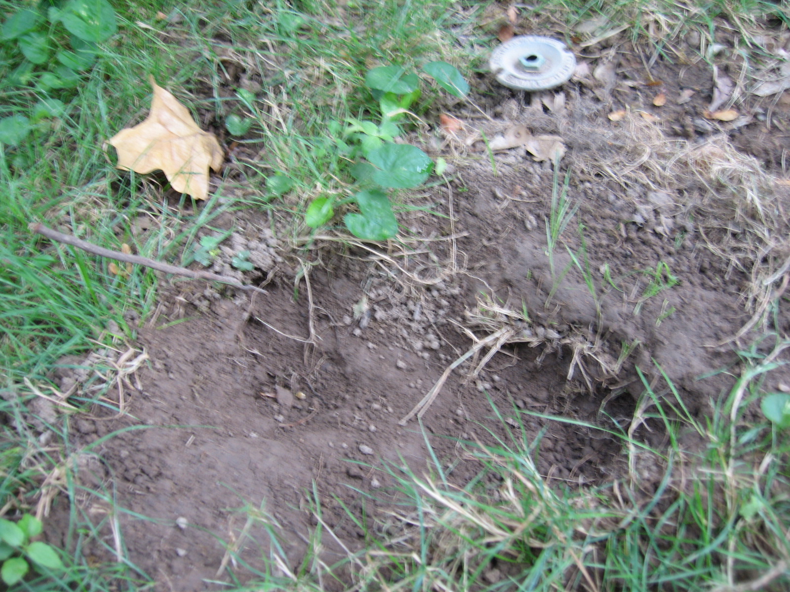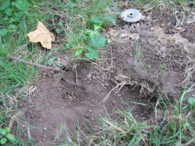 This is what Dennis calls a “butt cellar.” It’s a hole a squirrel dug next to the sprinkler, where the ground was moist enough to dig on the very hot days. He dug this and then he gets in there and sits all day to stay cool. When he’s in there all you can see is his ears sticking up!
