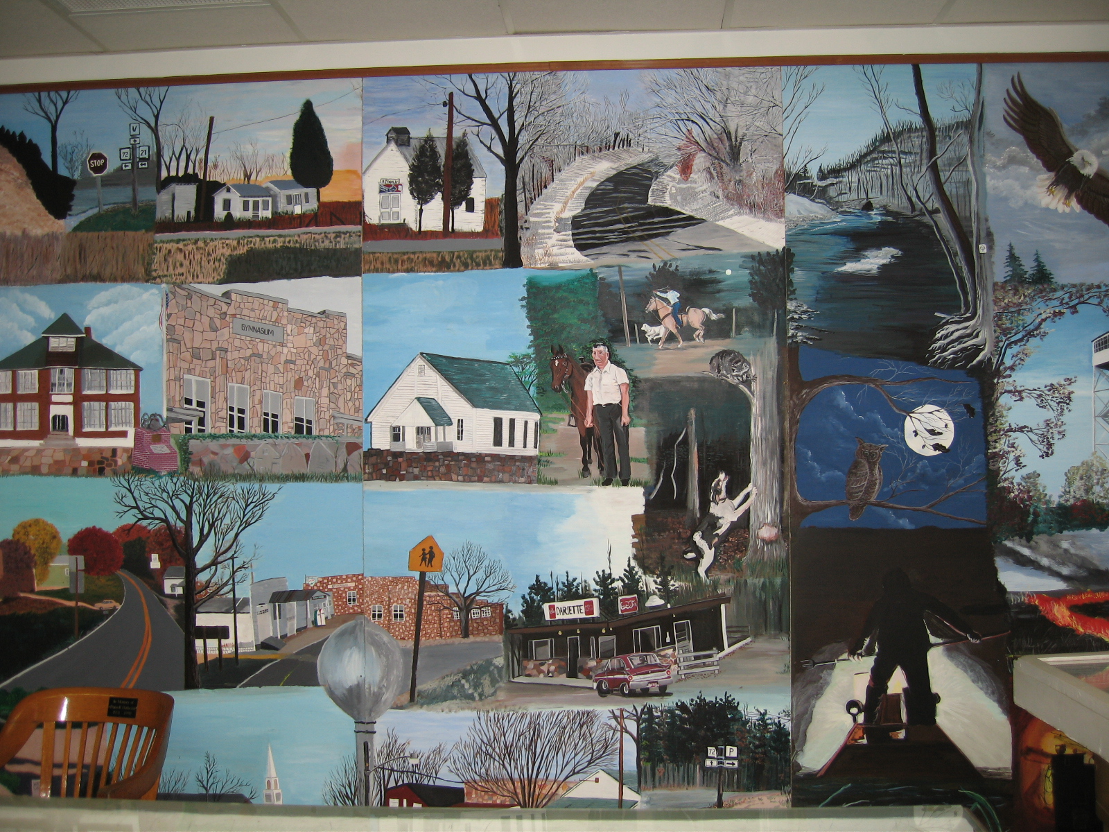 Mural in a room at the high school where they keep memorabilia. There were lots of old photos of the town’s founders who came to Bunker by way of the lumber boom. A family of women, several generations, and one or two of their husbands, has taken it upon themselves to maintain the old Bunker Union Church and Timber Museum. They were there when we went in, a mother, her daughter, and her niece.