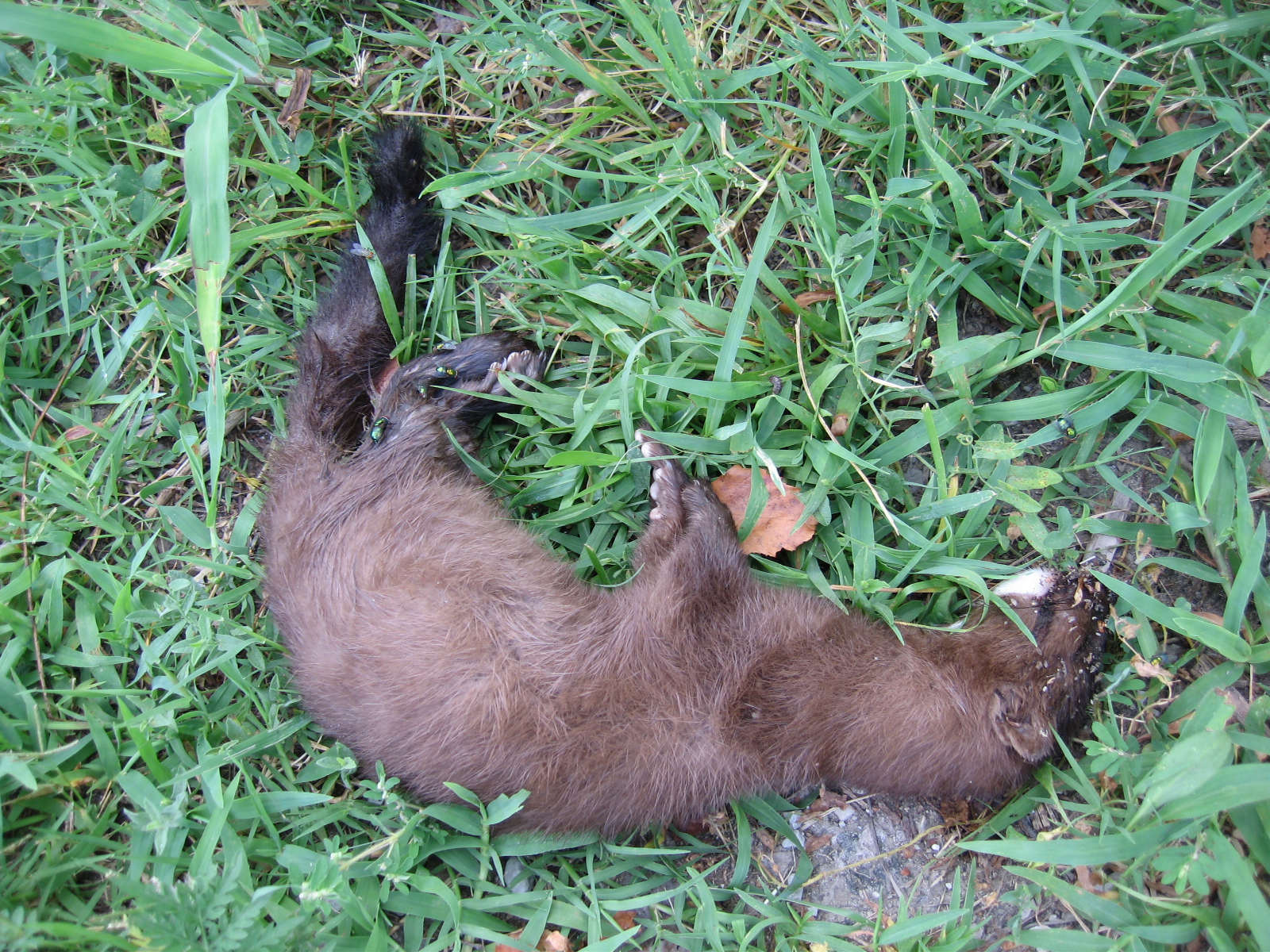 A squirrel sucking the gumption out of a beer bottle lying beside the road. A dead mink beside the path. There was blood in the middle of the path and a big stick beside it. I figure someone on a bicycle ran into the mink while he was crossing the path and either that same person shoved the dead mink to the side of the path with the stick or another soul did. Or maybe someone injured the mink and then killed it with the stick. My friend