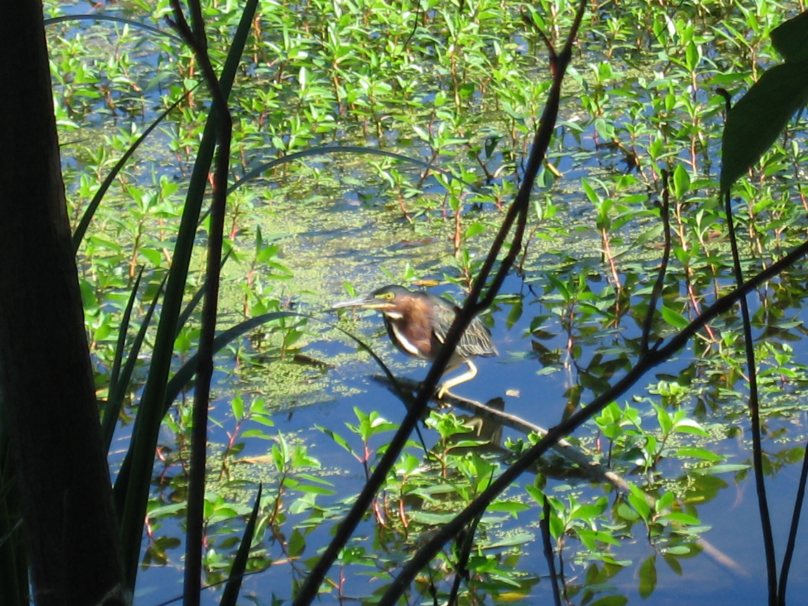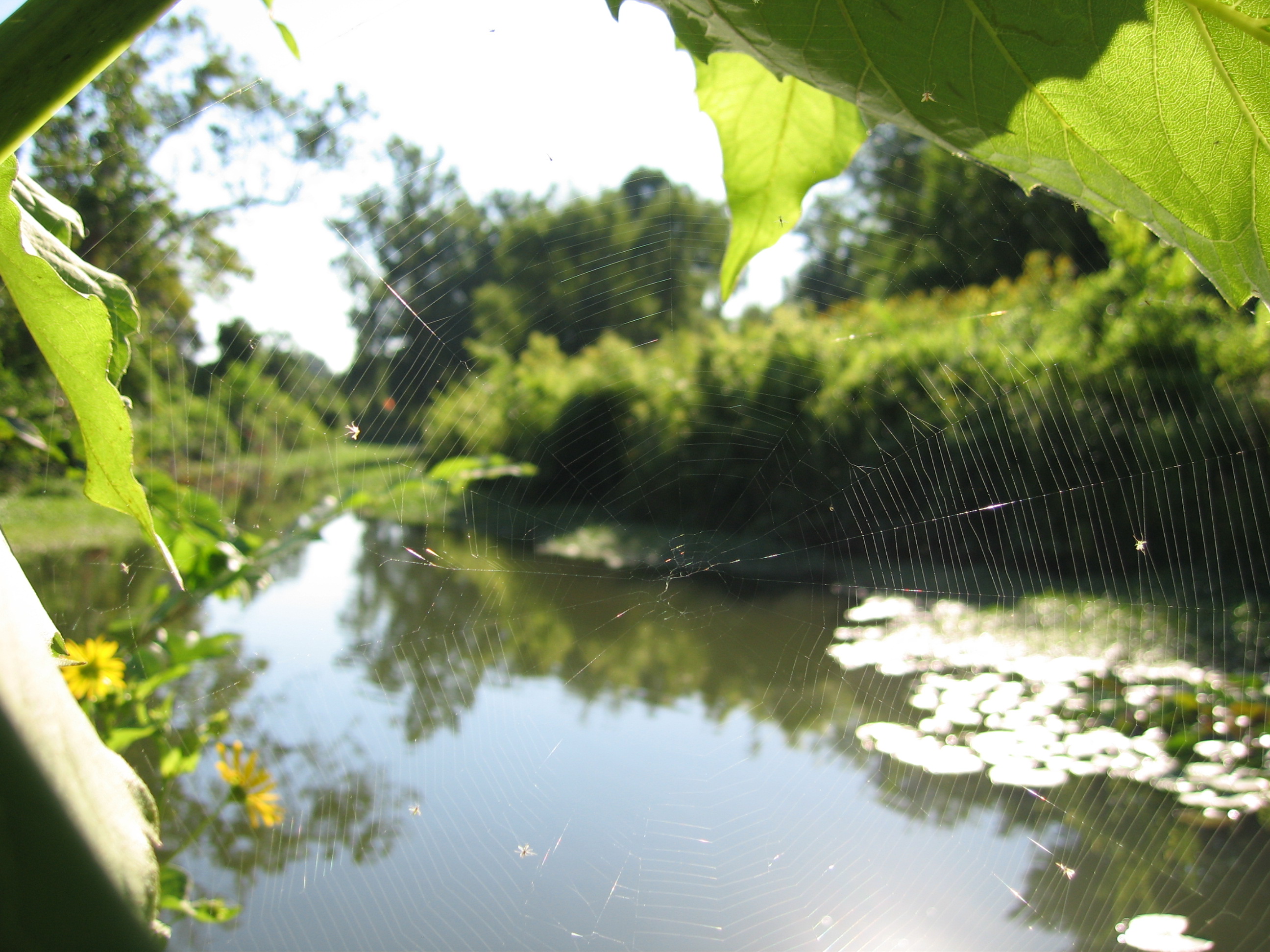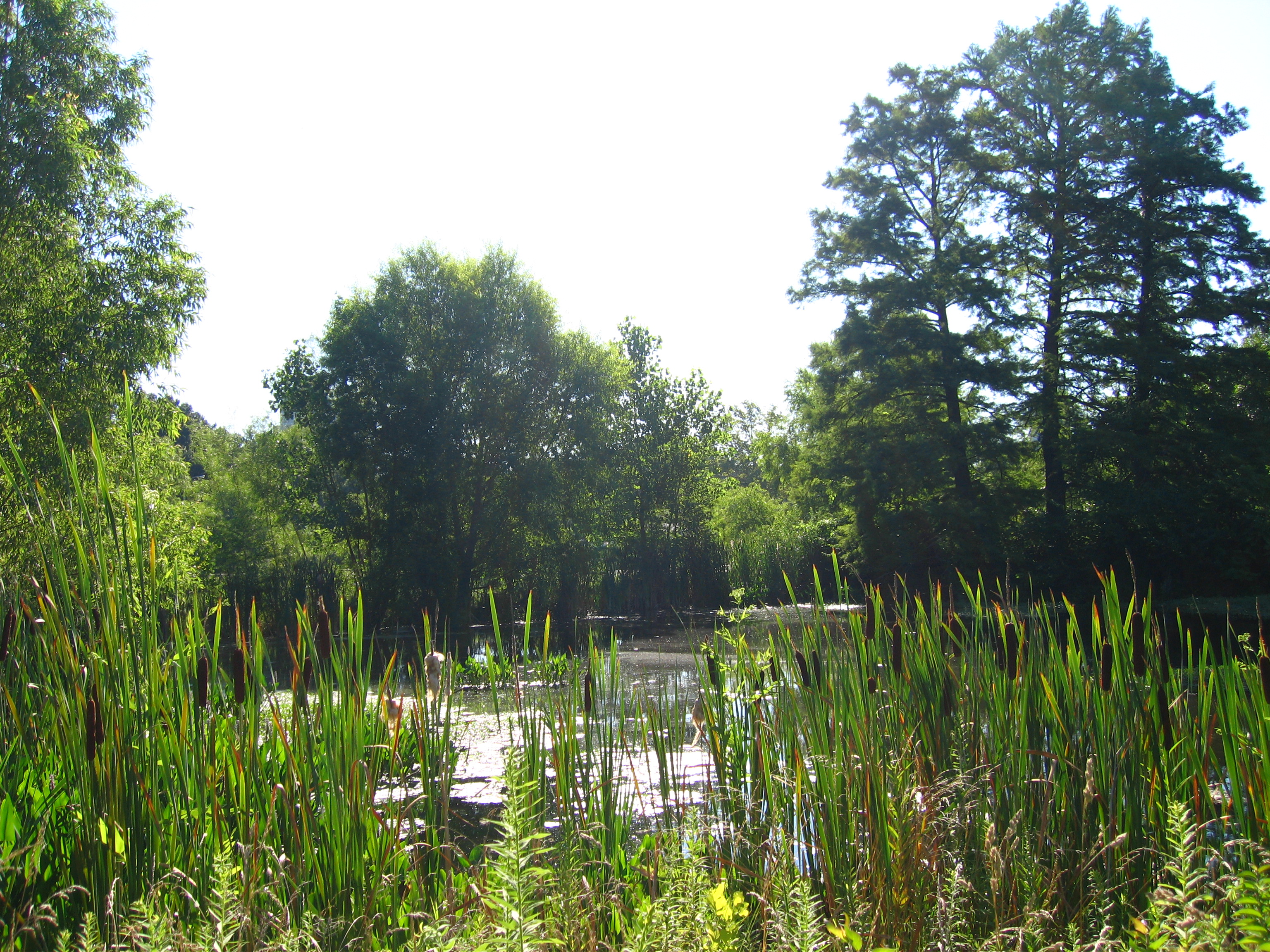 Pond that kingfishers were flying and chattering around- It looked like flight school, maybe, with an older kingfisher leading the younger one around and aound andaround in circles, chattering all the time like they do.