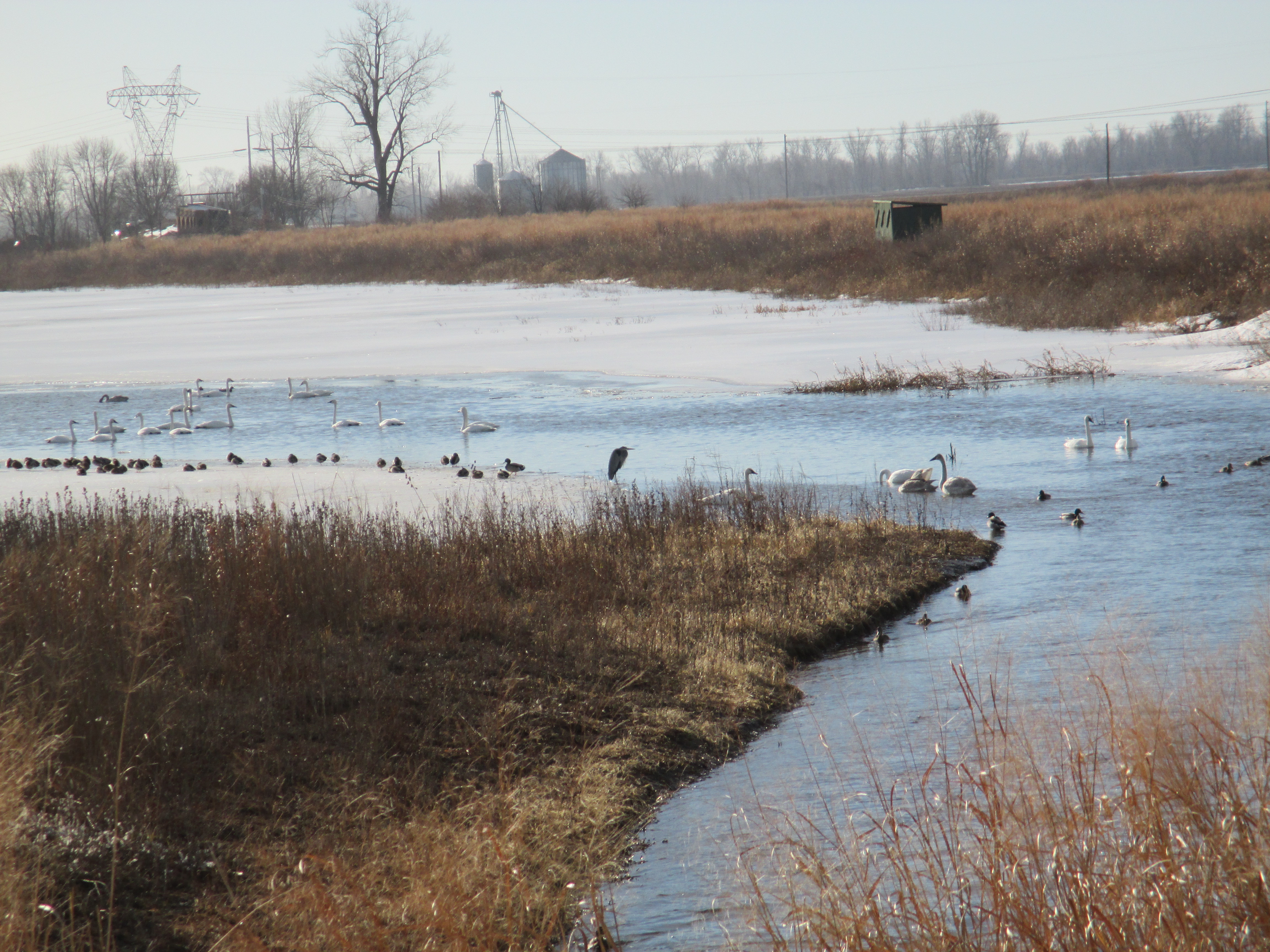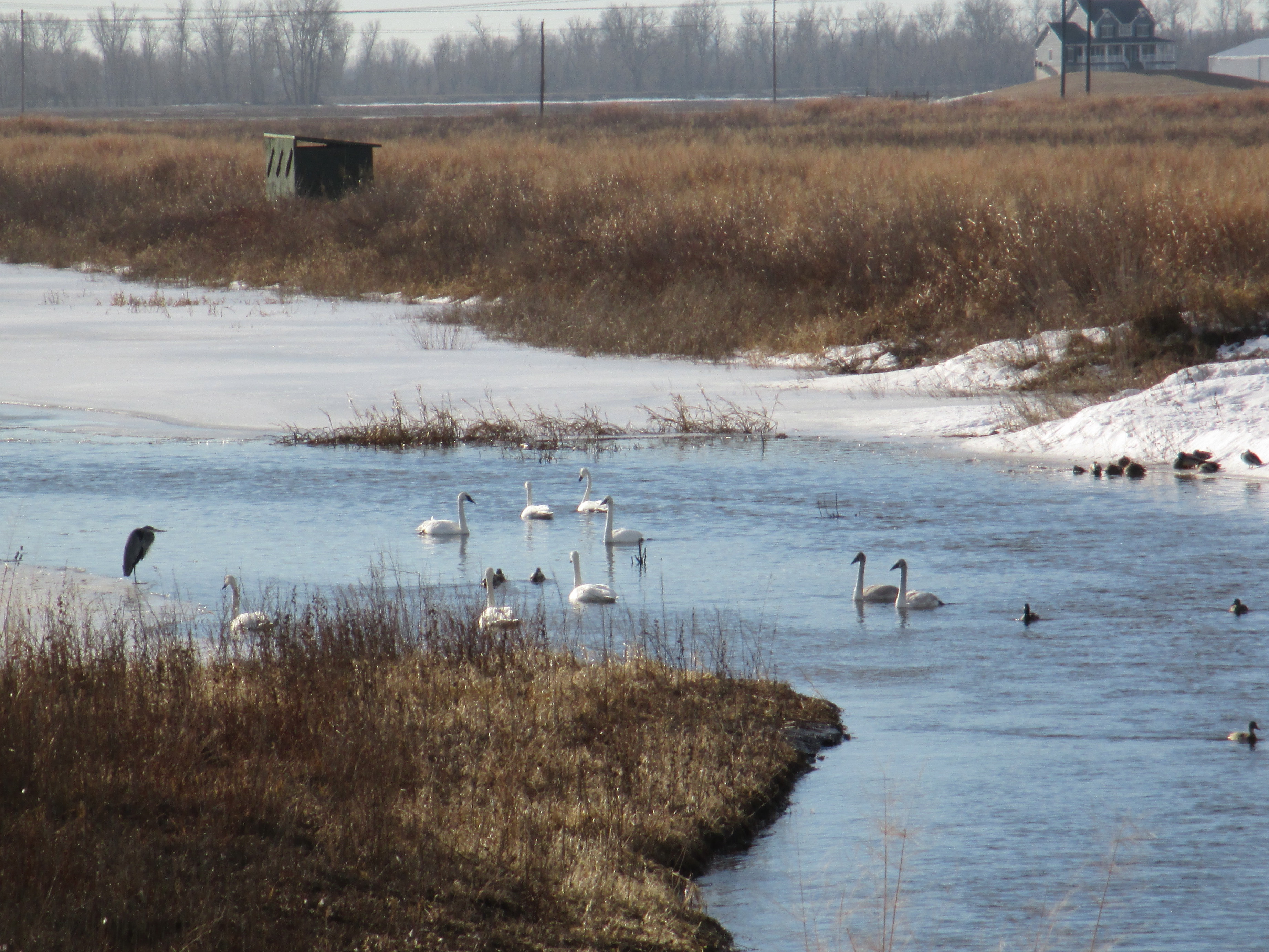 We went up the river on the Illinois side today to see the eagles, and on the way stopped by Riverlands, where there have been record numbers of trumpeter swans this winter. It was a warm day- almost 60- and lots of folks were out to see eagles. We saw many riding the ice flows in the river, remnants of last week’s cold, but I took no pictures. Here are some trumpeter swans and a great blue heron: