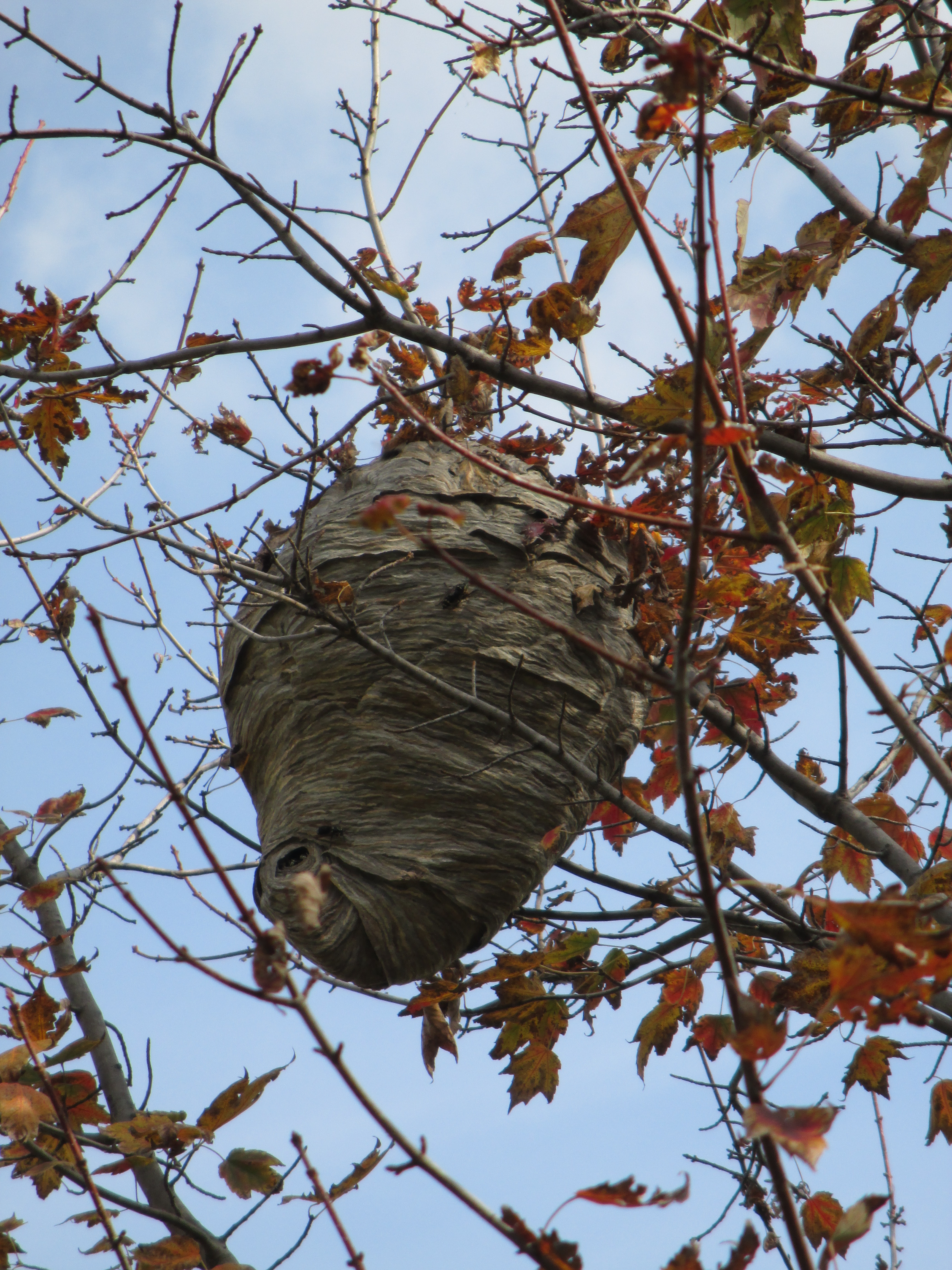And a paper hornet’s nest in a maple tree. I could see the hornets coming and going- if you look closely you can see one near the entrance at the bottom:
