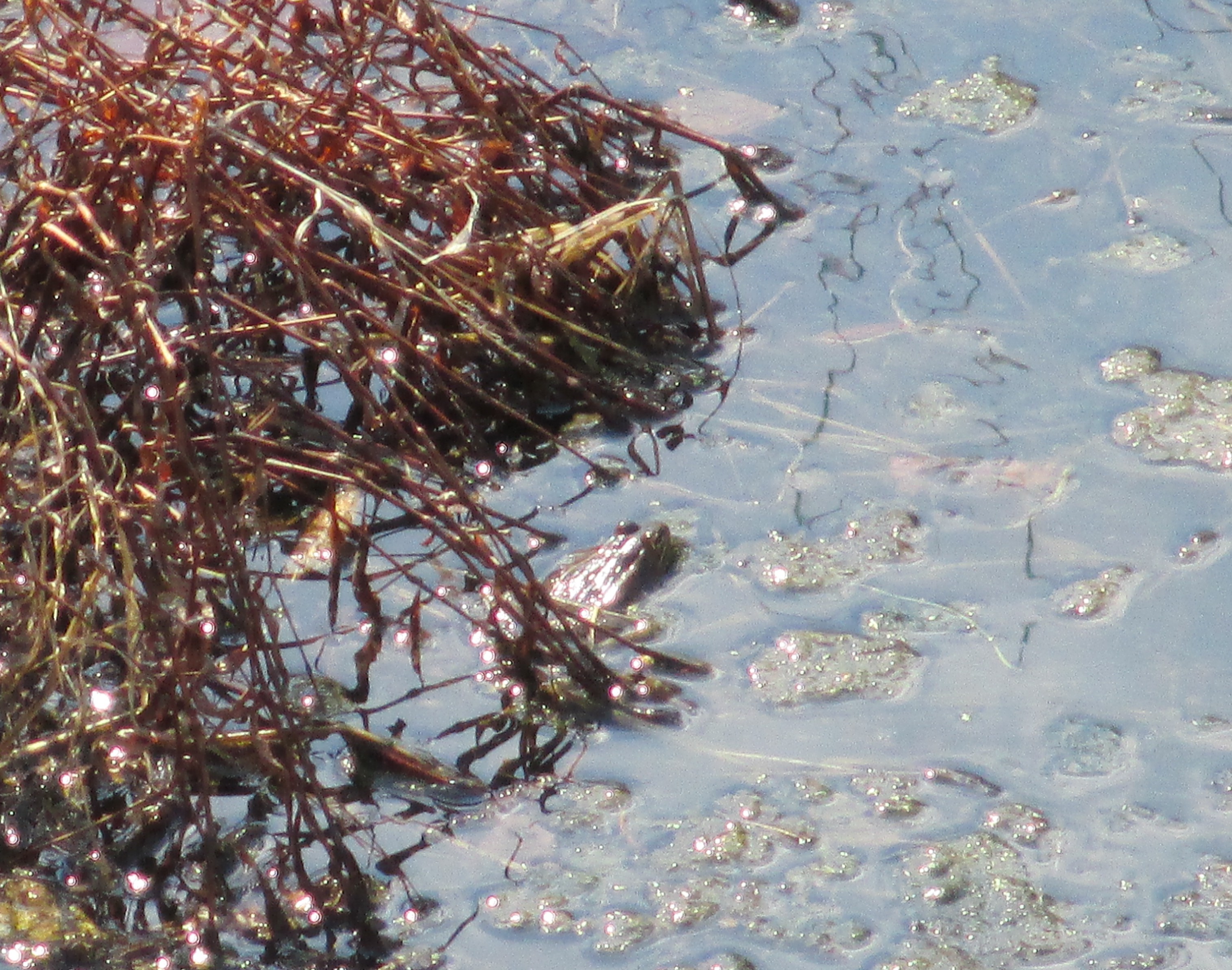 When I took a walk yesterday to allay some anxiety about an upcoming presentation I saw this leopard frog, and he was singing!