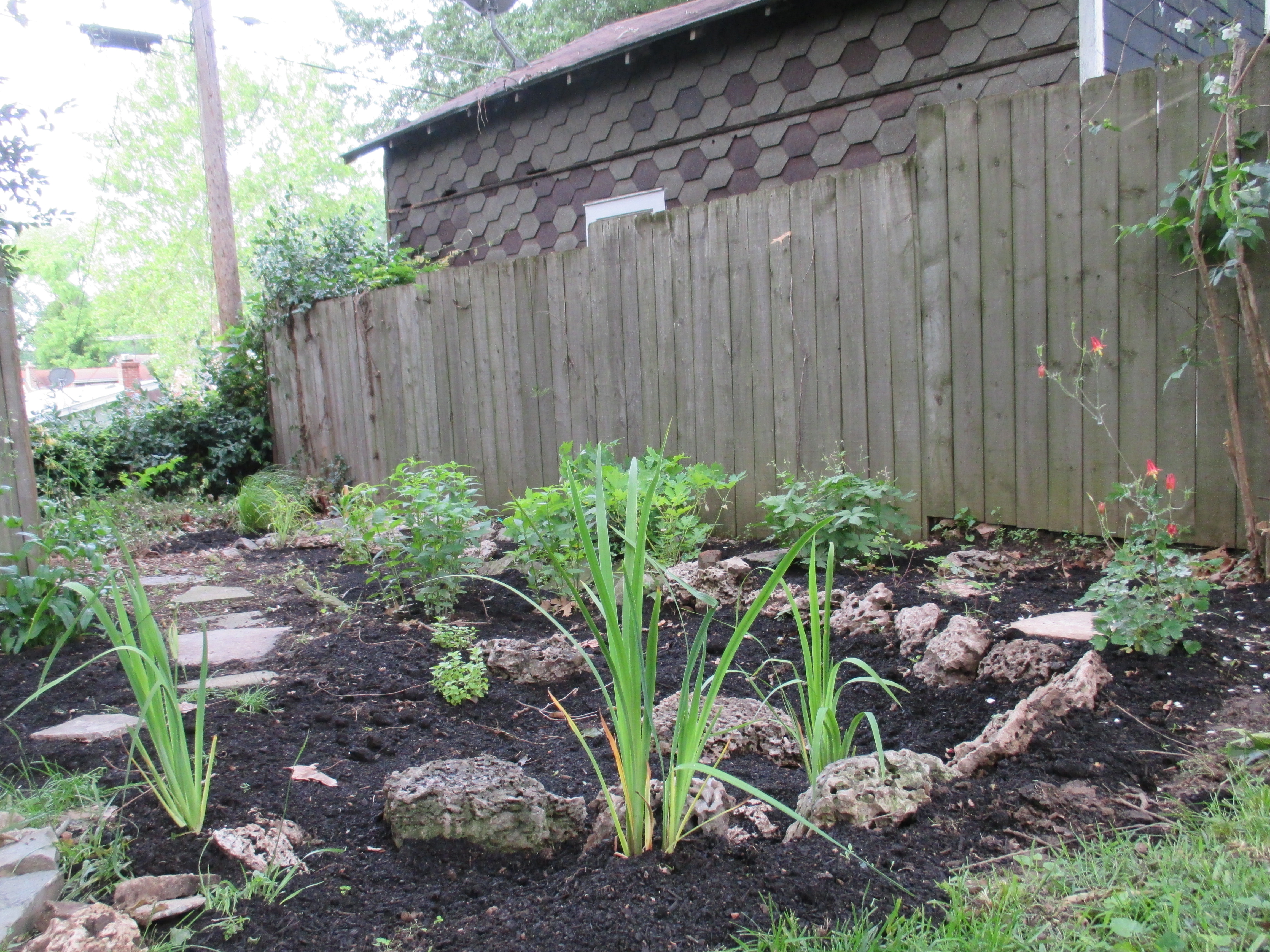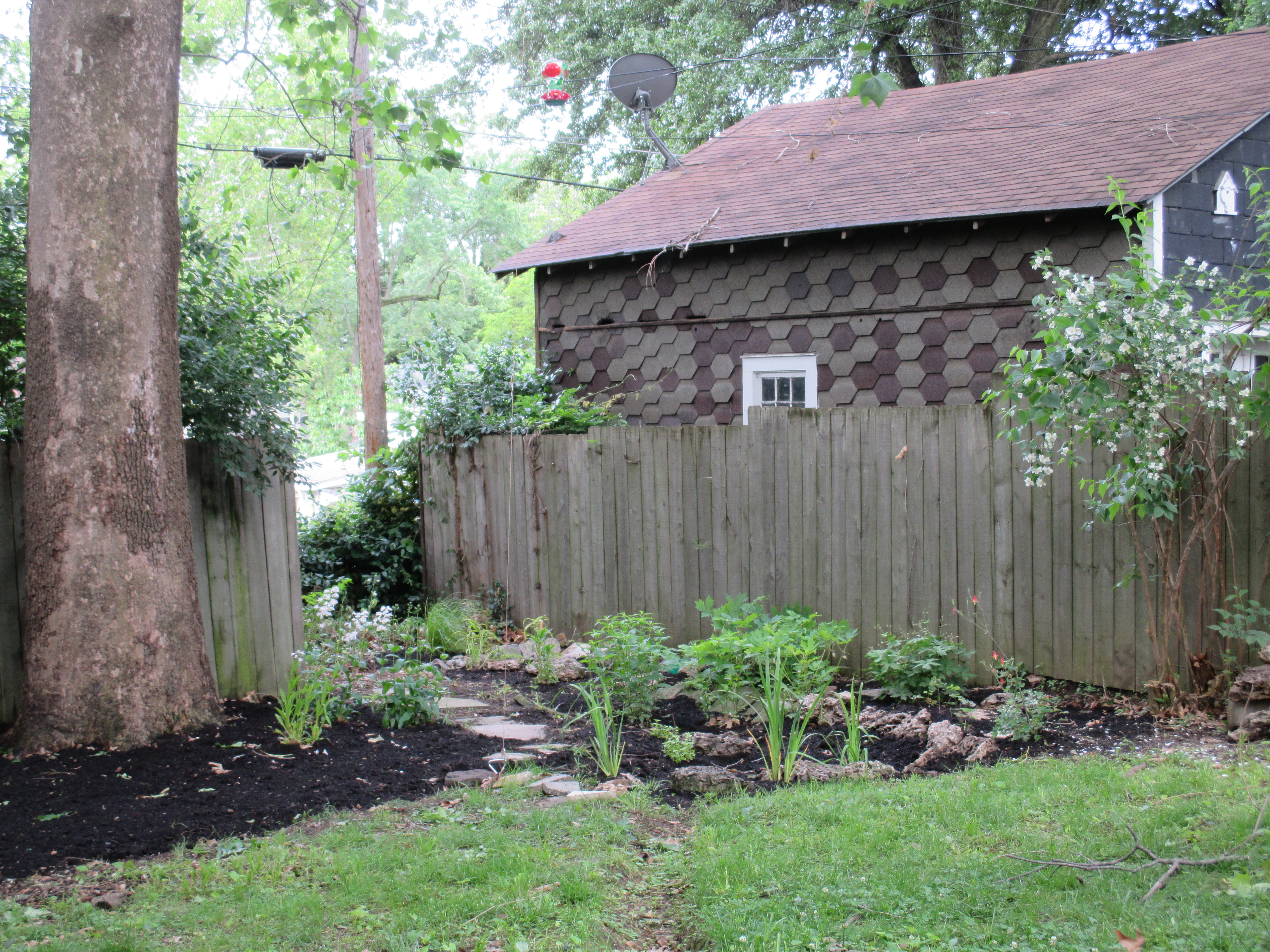 Was hoping for then and now pics but I can’t find the older ones. Anyway, here it is this morning, after 2 days of hauling mulch and rocks and plants etc (I love this work!):