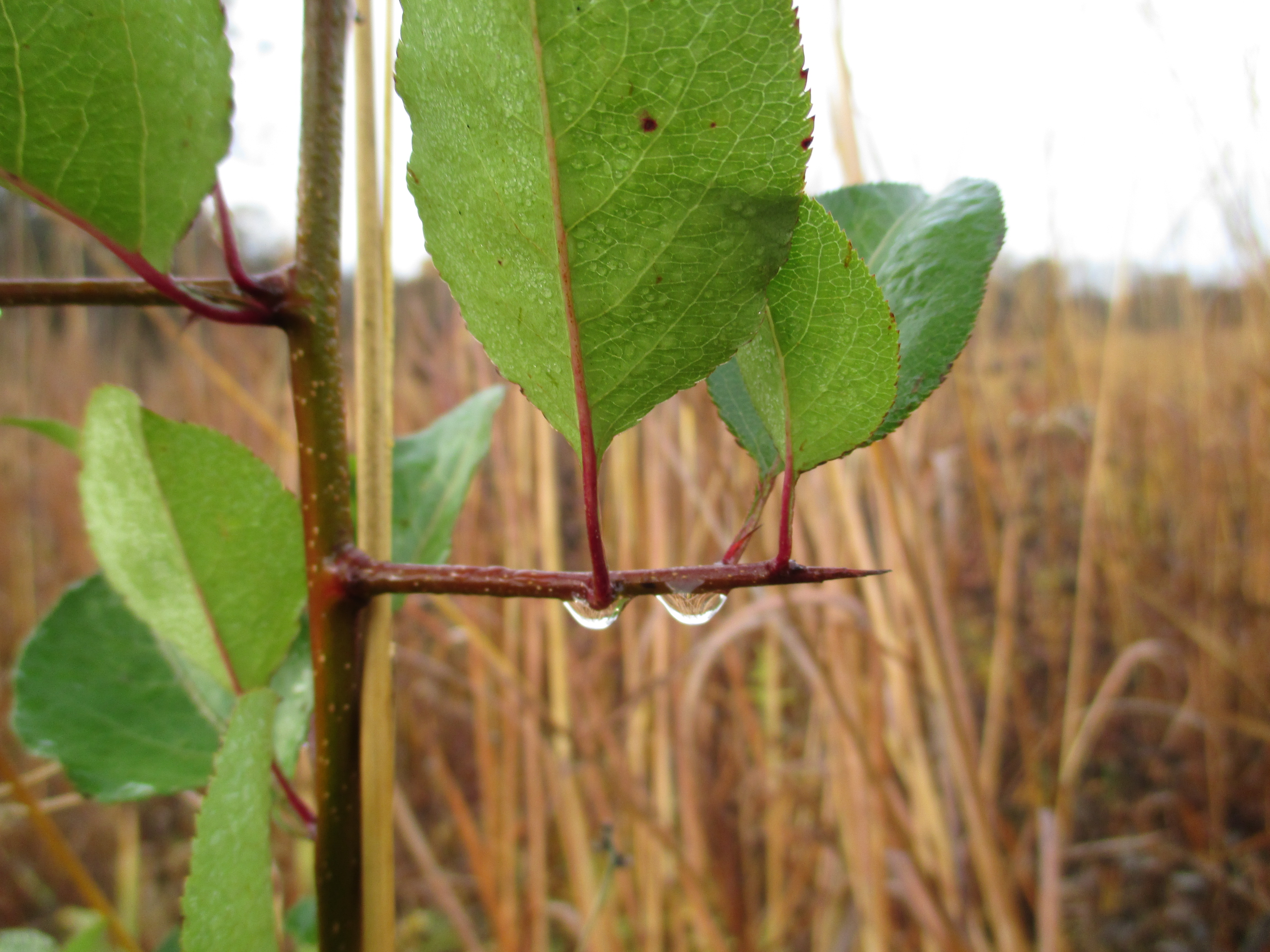 A preying mantis egg case in morning sun. With little water in the ground, it was good to see the dew on the plants.