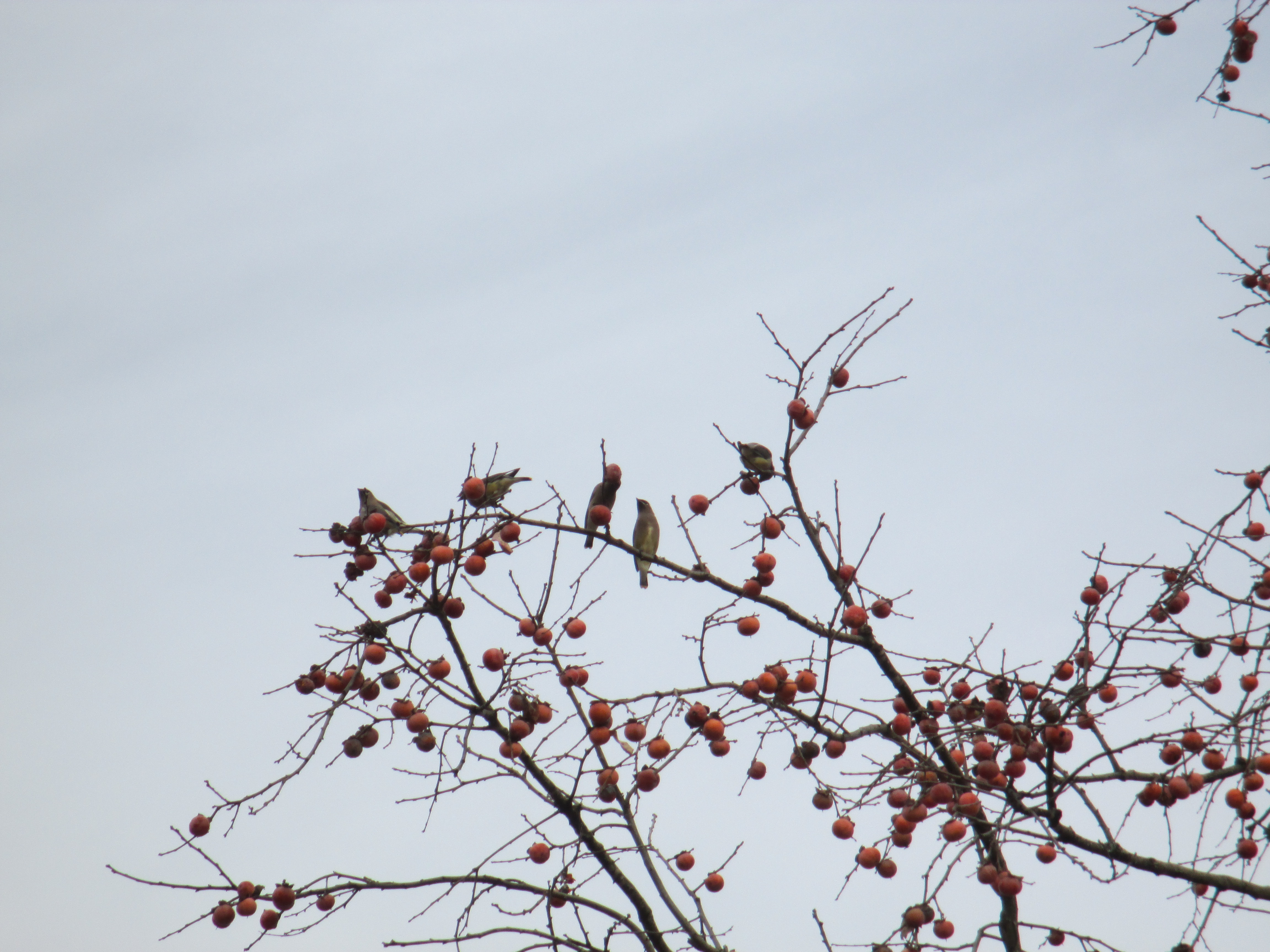 It was after seeing the waxwings I noticed a woodpecker return time and time again to a nearby pin oak tree. I followed his route with my eyes and saw that he was taking something from the pin oak to a tree in the woods where, presumably, he had a nest hole or cache of some sort. He put whatever he carried from the pin oak there and returned to get another load. Then I noticed many other woodpeckers and blue jays doing the same thing. At first I thought it must be acorns, but none of the other nearby pin oaks were getting this sort of attention. Dennis surmised an insect of some sort, perhaps that tree was infested with some yummy larvae or something- we’ve yet to research what it might have been but it was fun to watch.