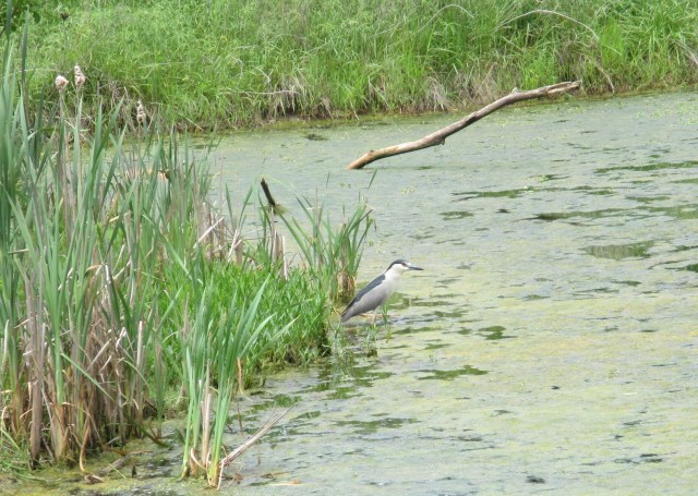 On a mid-day walk I saw: 2 little girls all dressed up to watch someone graduate from college; a martin chasing a black-crowned night heron away from the martin house; young goslings with their parents; an American egret and a snowy egret sharing a riffle where the fishing was good- I saw the American catch and eat 3 fish; red-winged blackbirds guarding their nests (last Sunday on a walk I got too close to a nest and one of them actually made contact with my scalp, I had little scratches from his claws, at least he didn’t peck me); catalpas are blooming.