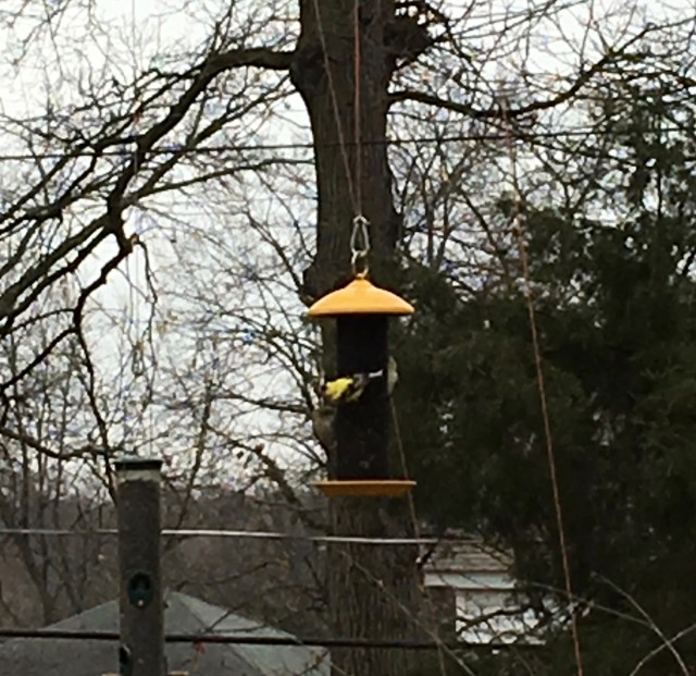 Not the best picture but enough to see that this year we have lots of goldfinches at our feeders. Exciting because we have never had this many before, and I love to watch the males color turn from their winter color, sort of olive green, to the bright yellow of springtime.