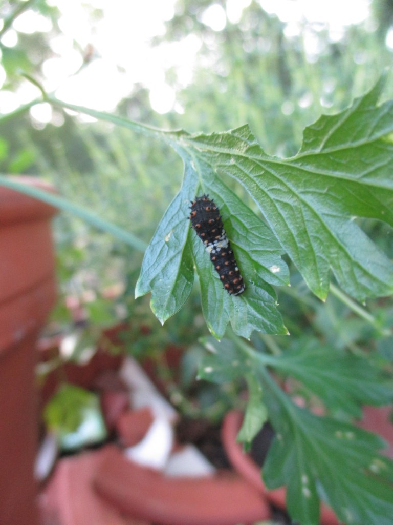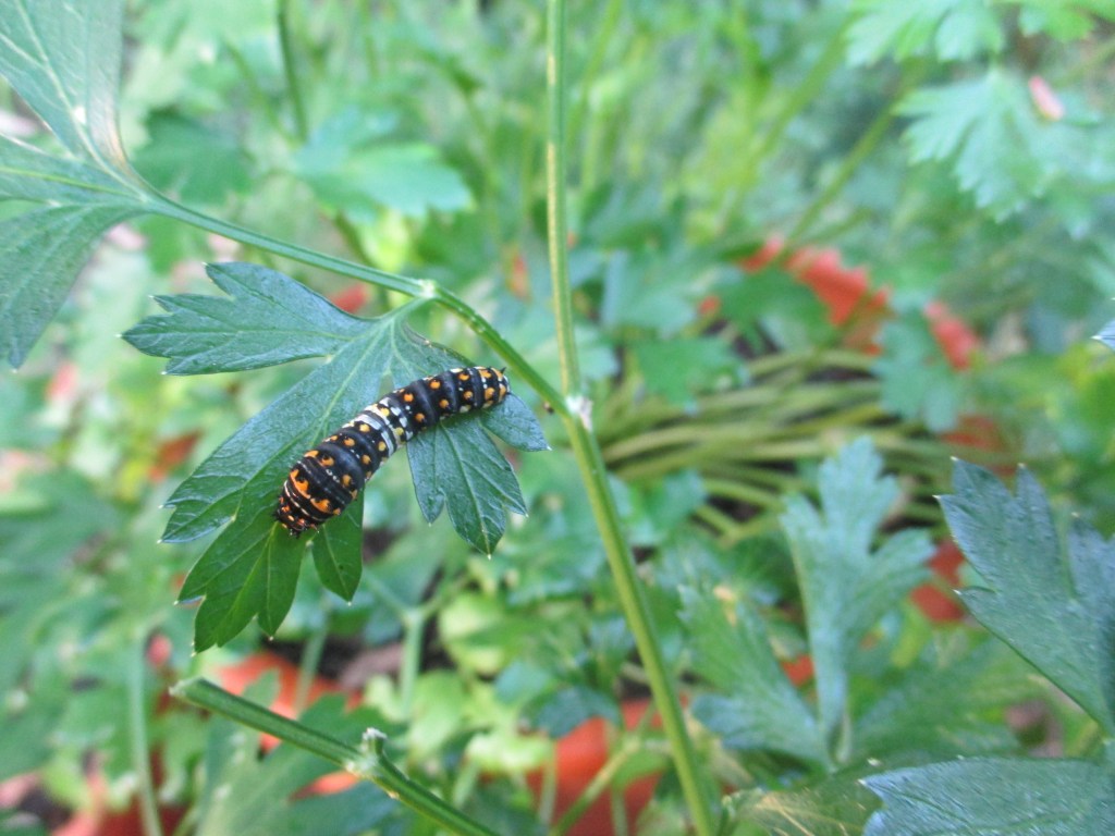 This year we have blck swallowtail caterpillars. I witnessed a black swallowtail laying her eggs on the parsley we have planted in pots, and have kept my eye on the development of the four cats. They move from one stage to another in a matter of days, and yesterday I noticed one has reached chrysalis stage. Here are some stages of development: