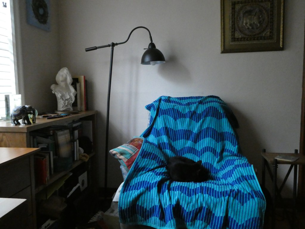 Home office- Kitten Britches at her station and me with long hair. It’s coming off soon; I am tired of it.