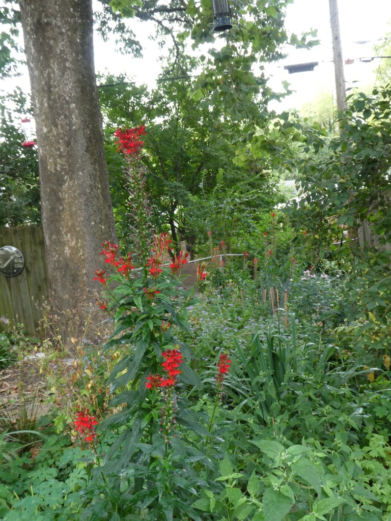 The cardinal flower that is jealously guarded by the alpha hummingbird who hangs around to chase away all the other hummers. Occasinally they come in bunches and some of them get to sip nectar while he chases the others.